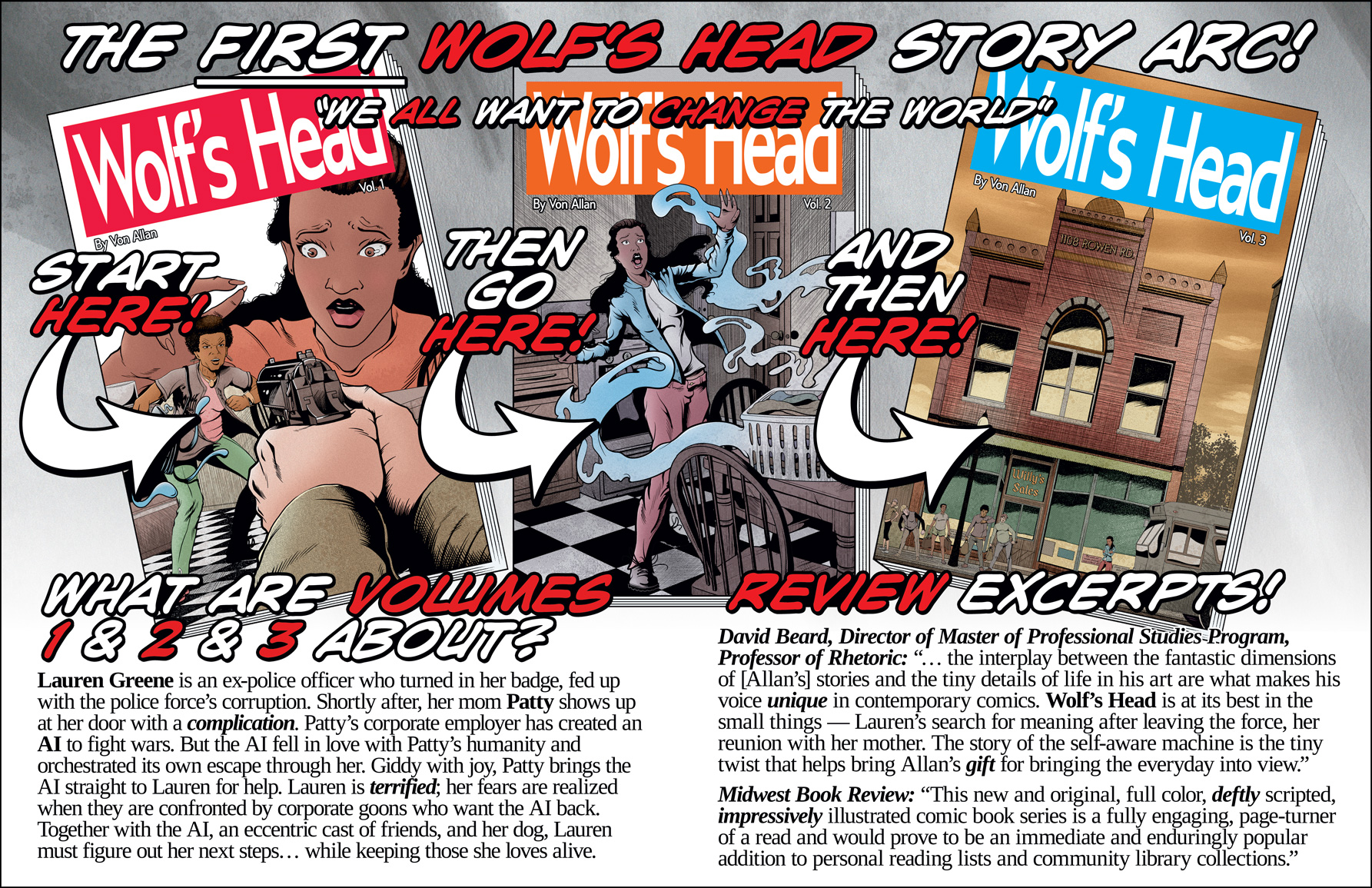 library collections.David Beard, Writing Studies BA Program Coordinator, Director of Master of Professional Studies Program, Professor of Rhetoric, International Journal of Comic Art on WOLF’S HEAD BOOK 1 — WE ALL WANT TO CHANGE THE WORLD: “In a longer work like WOLF’S HEAD, the interplay between the fantastic dimensions of his stories and the tiny details of life in his art are what makes his voice unique in contemporary comics. WOLF’S HEAD is at its best in the small things — Lauren’s search for meaning after leaving the force, her reunion with her mother. The story of the self-aware machine is the tiny twist that helps bring Von Allan’s gift for bringing the everyday into view.”