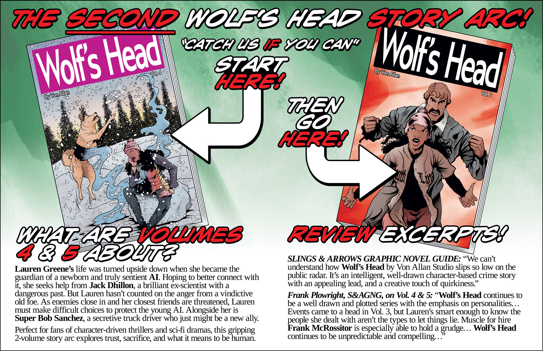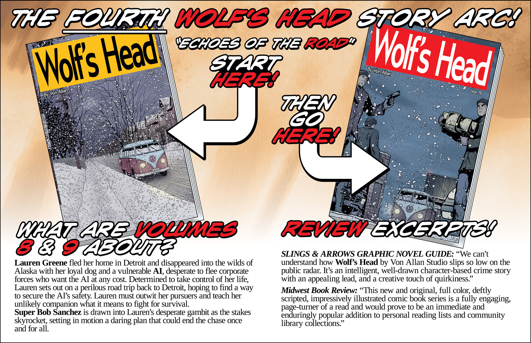 Wolf’s Head, Von Allan, and all characters and likenesses are ™ and © 2017-2025 Eric Allan Julien. All rights reserved. No reproduction without prior written permission of the publisher except brief passages in reviews. Names, characters, and incidents featured in this publication either are a product of the author’s imagination or are used fictitiously. Any resemblance to actual persons living or dead or events, without satiric intent, is coincidental.Published by Von Allan Studio, Ottawa, Ontario, Canada.