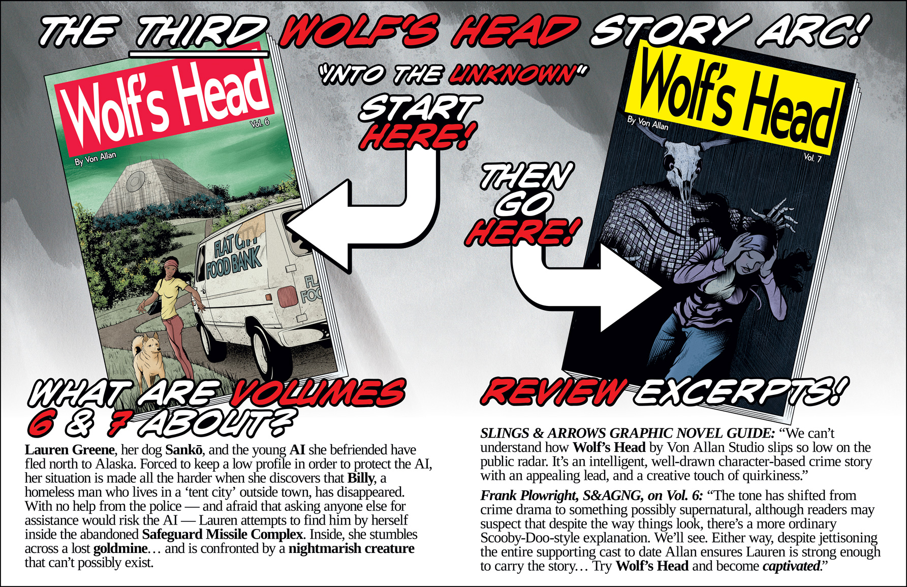 - Volume 6 ISBN: 978-1-989885-28-4 (More details at https://wolfs-head.vonallan.com/p/wolfs-head-volume-6.html)